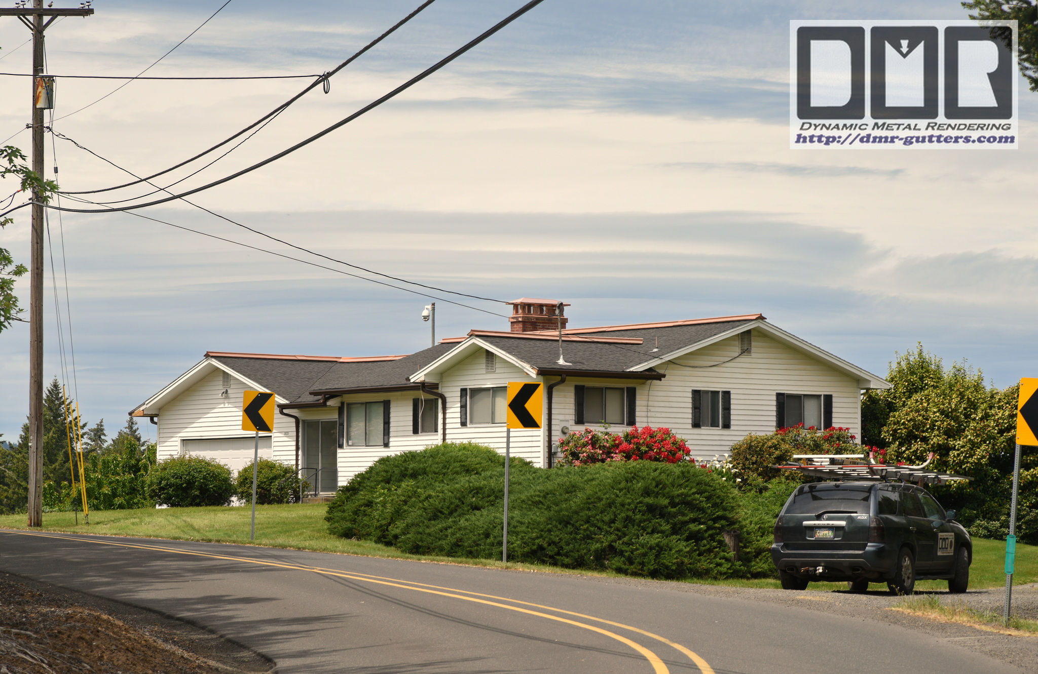 click on this link to see 42 photos and read more about this project details: (5/20) Traina - $8.5k10829 S. W. 49th, Portland, Oregon Black Gutters & DS, Facia Boards, Fascia Metal, Rake Metal, Screens, No-clog Outlets, Leaf-catchers, Cedar Handrails, & Cedar Frame Awning Roof Clad w/Aluminum & Copper.